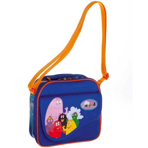 Barbapapa blue lunch bag silkscreened 1 small compartment on the front of the bag . 1 compartment With carrying handle and adjustable shoulder strap . Upper and lining 100% polyester . Cleaning with a sponge . Dim : 21 x 20 x 8 cm