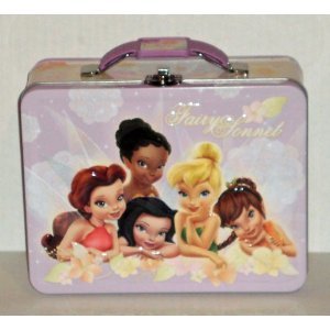 Metal lunch box featuring famous Disney fairy, Tinkerbell! Measures approximately 7-5/8" x 6" x 2-3/4"H. Metal latch and plastic handle. Features an embossed design on the front. One per order. Style may vary