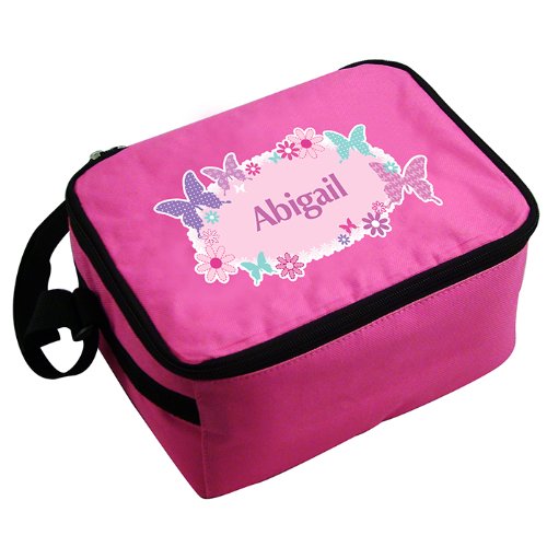 Send your kid`s lunch to school in this funky Pink Butterfly lunch bag!Personalise this lunch bag with any first name up to 12 characters (please include the `s if required)This bag also has an adjustable shoulder strap which measures 122cm at the longest length and has a white wipe-able interior with insulated lining. NOTE: Due to the font type used please refrain from using all capitals in your personalised message. If the message is all in capitals you will find the personalisation extremely difficult to understand and may even result in personalisation being missed off the product. Many thanks for your cooperation.Jessica - AcceptableJESSICA - Not AcceptableIdeal for Back to School.