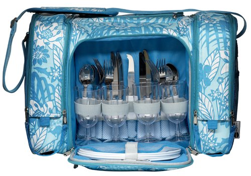 Dolphin picnic bag with shoulder strap for four people.Contains: Three large cool sections, plus plates, cutlery, glasses napkins, cheese knife and bottle opener. Size: 470x260x320mmColours available: Blue